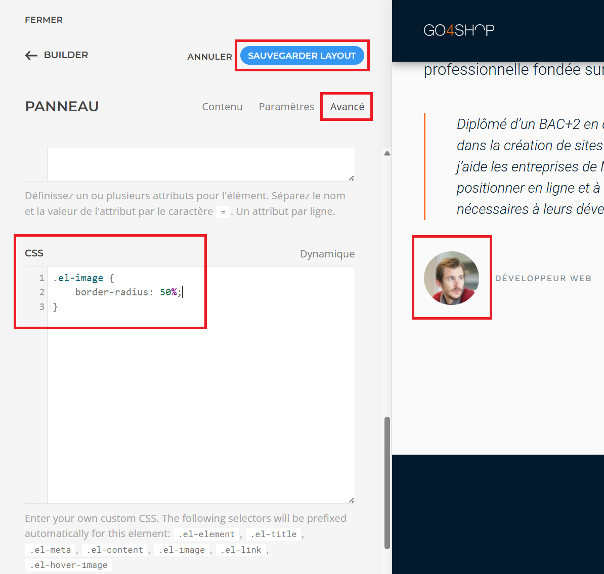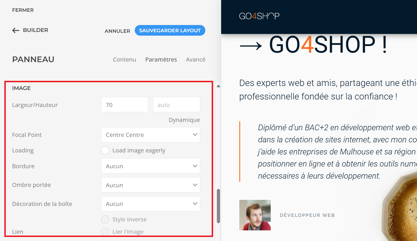 Au final, n’oubliez pas de sauvegarder les modifications en appuyant sur le bouton Sauvegarder layout en haut du module !
