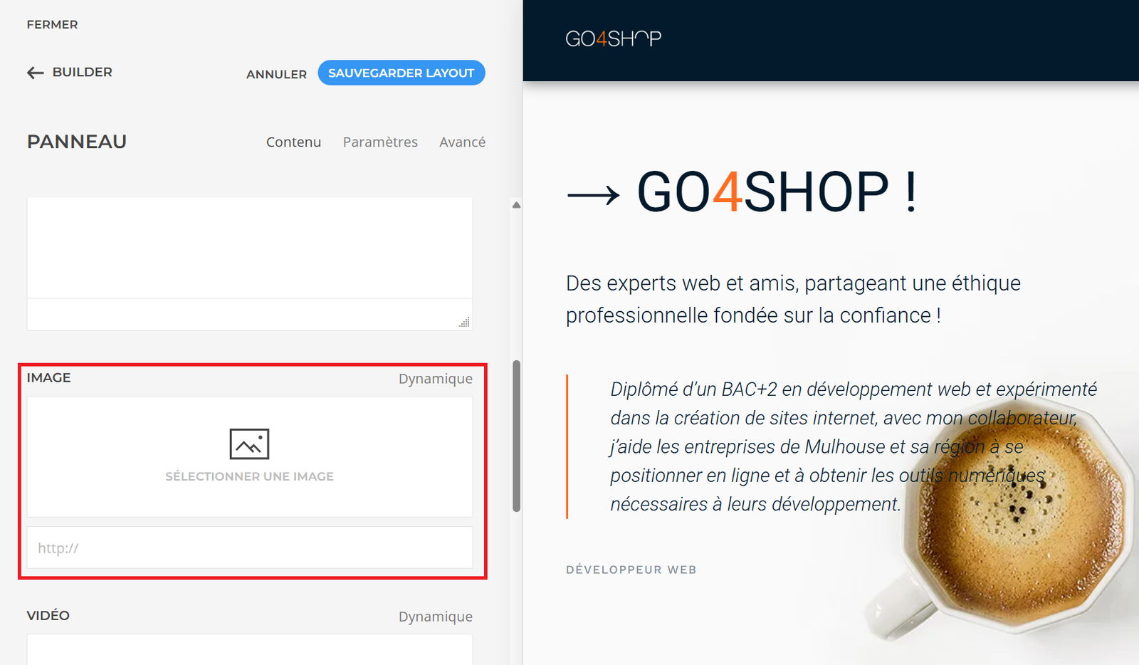 Cela va ouvrir le panneau gauche avec trois options en haut : Contenu, Paramètres et Avancé. Cliquez sur la partie Contenu > IMAGE et téléverser/choisissez l’image que vous voulez afficher.