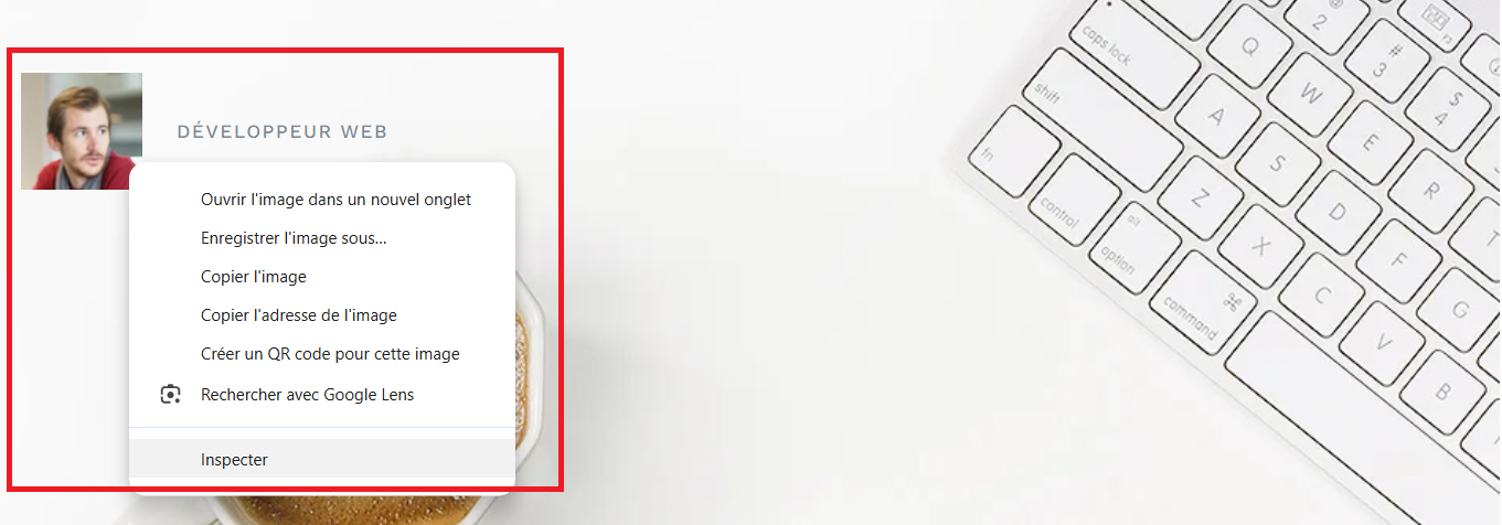 Si nous somme alaise avec le CSS, nous pouvons tout d’abord inspecter l’image en faisant le click droit sur l’image avec le souris.